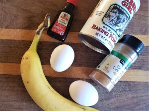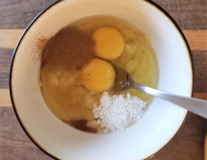 1. Mash the banana until smooth. Blend in eggs, cinnamon, vanilla and baking powder.